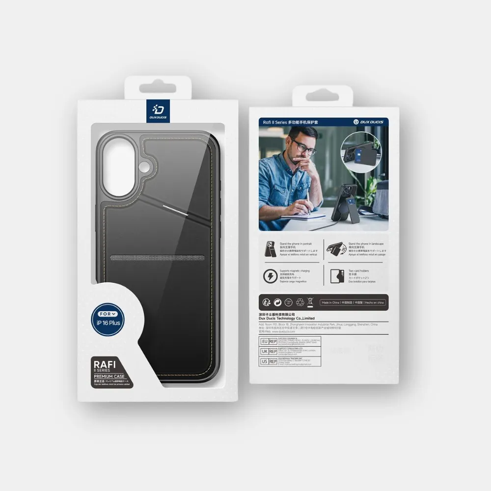 A Dux Ducis Rafi II MagSafe tok egy fejlett megoldás okostelefonokhoz, kompatibilis a MagSafe töltéssel. Két kártyanyílással, RAFID zárral és állítható állvánnyal rendelkezik.