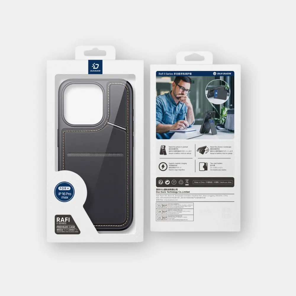A Dux Ducis Rafi II MagSafe tok egy fejlett megoldás okostelefonokhoz, kompatibilis a MagSafe töltéssel. Két kártyanyílással, RAFID zárral és állítható állvánnyal rendelkezik.